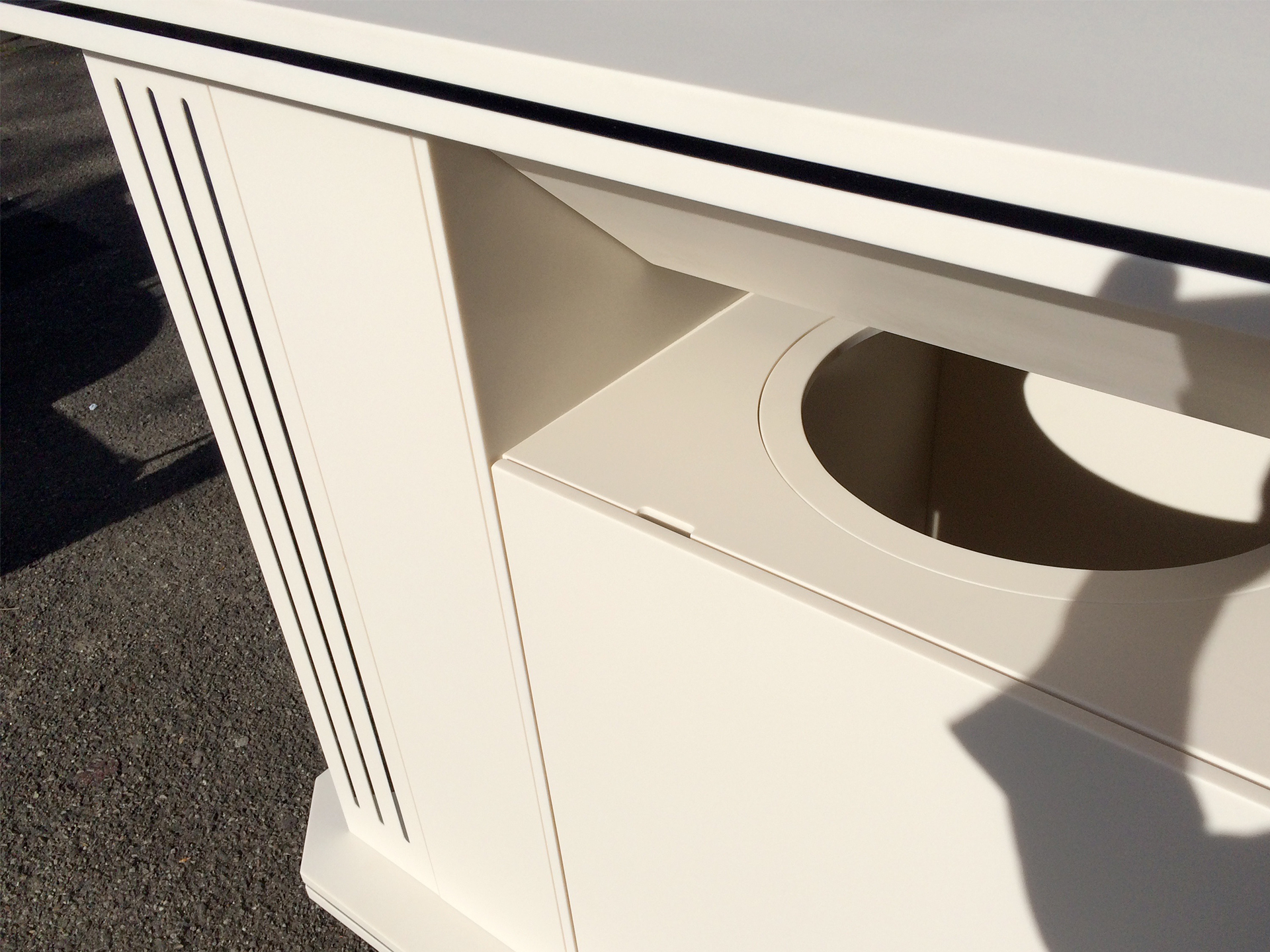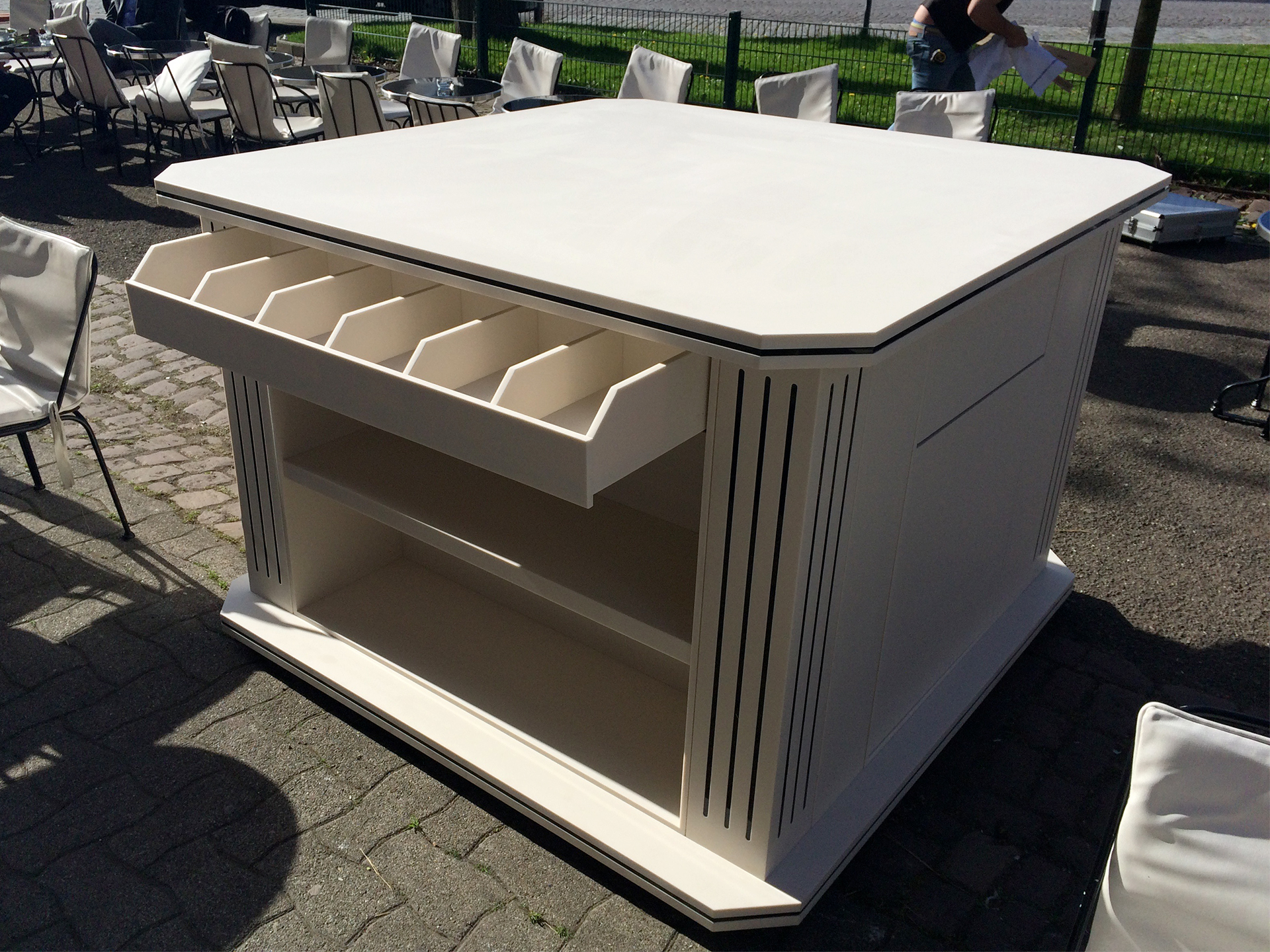 La structure de ce mobilier de terrasse est composée d’une ossature en aluminium. Celle-ci est recouverte d’un matériaux composite en résine (Corian). Un alliage de matériau à l’épreuve du temps et des intempéries.